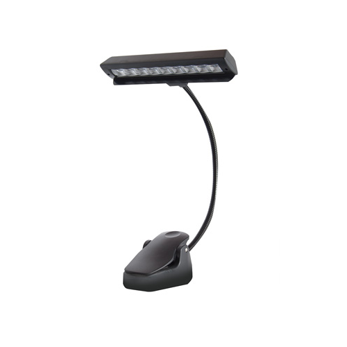 Music stand light. 9 bright LEDs mounted on 290mm flexible gooseneck arm. Two settings. Spring clip mount. Runs on 3 x AA batteries (not incl). Black.